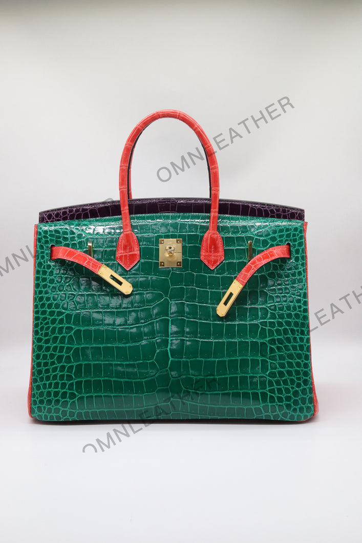 London 35 Birkin Style HCP Saltwater Croc Leather Glossy Green Mix Color Gold Hardware