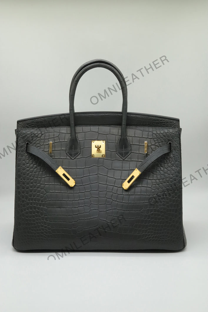 London 35 Birkin Style HCP Saltwater Croc Leather Opaque Graphite Grey Color Gold Hardware
