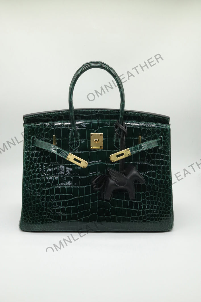 London 35 Birkin Style Saltwater Croc Leather Glossy Green Color Gold Hardware
