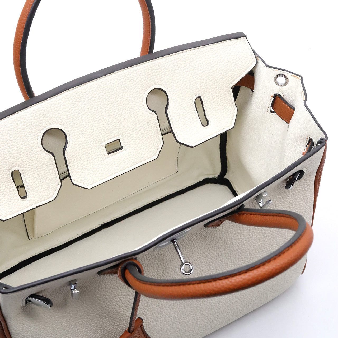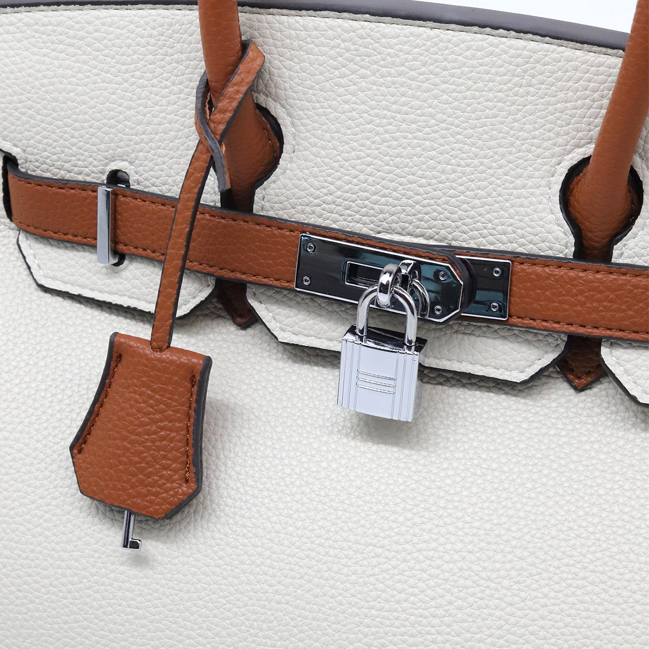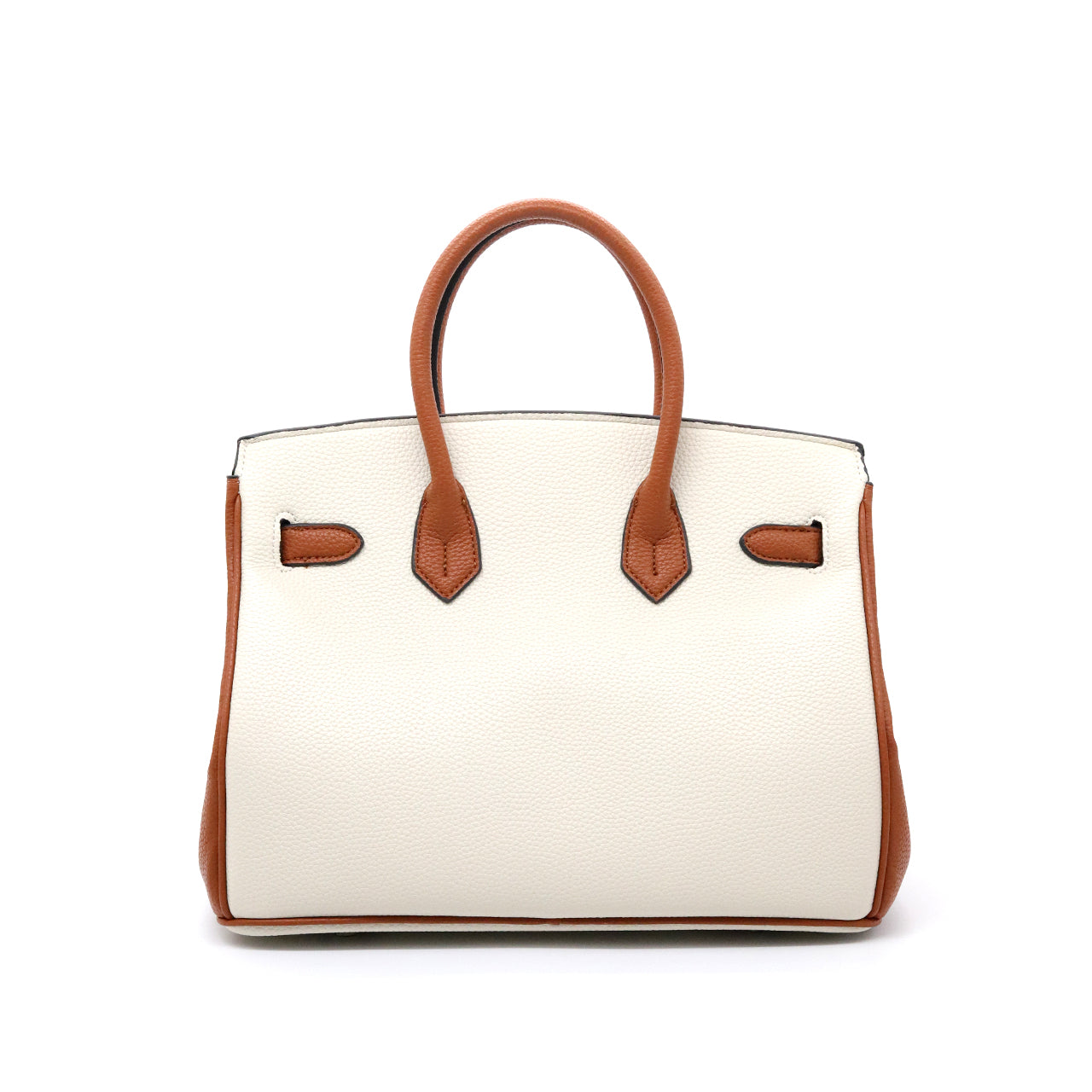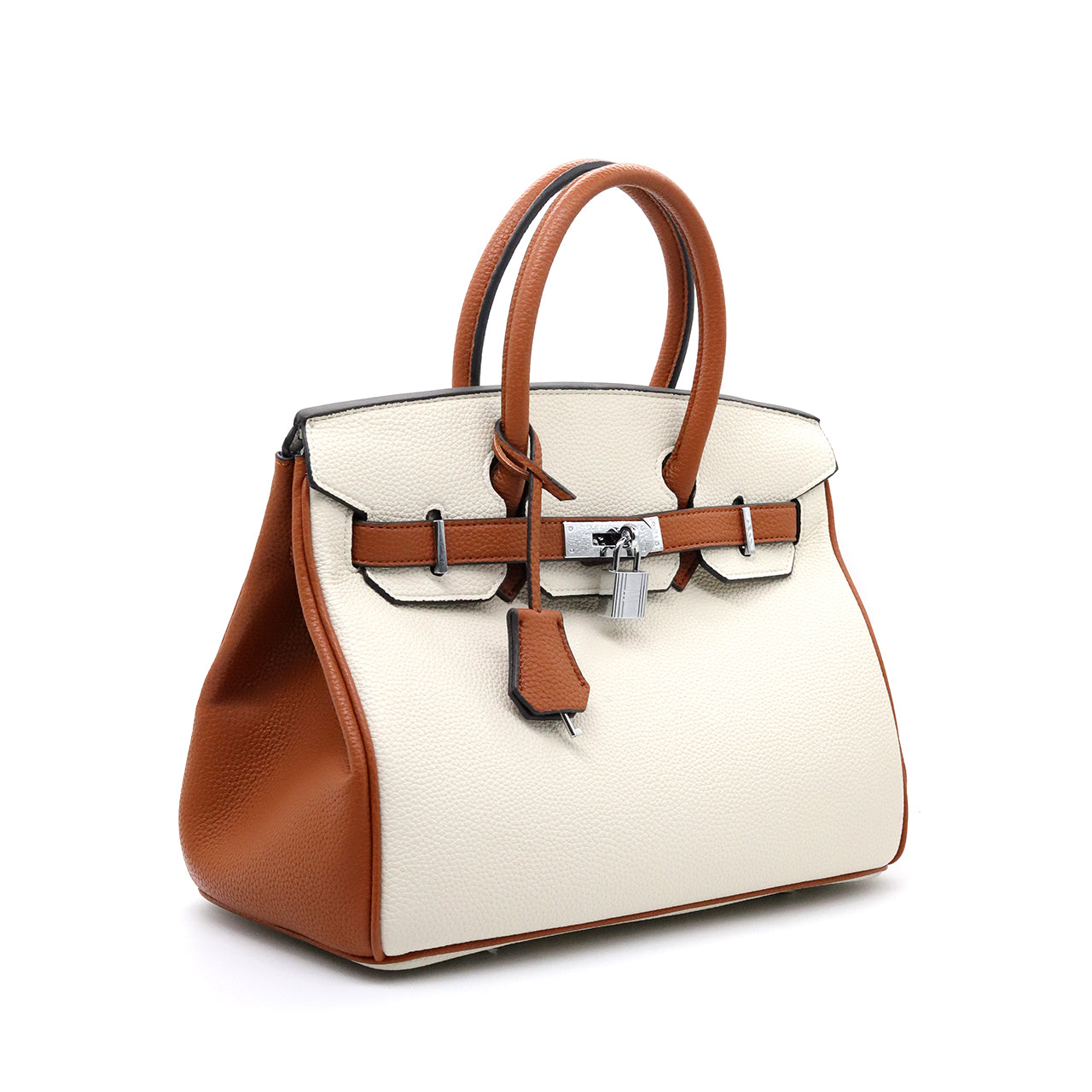 Classic style top handle bag with single flap, wrap through strap with lock, attachable shoulder strap, front side mixed color