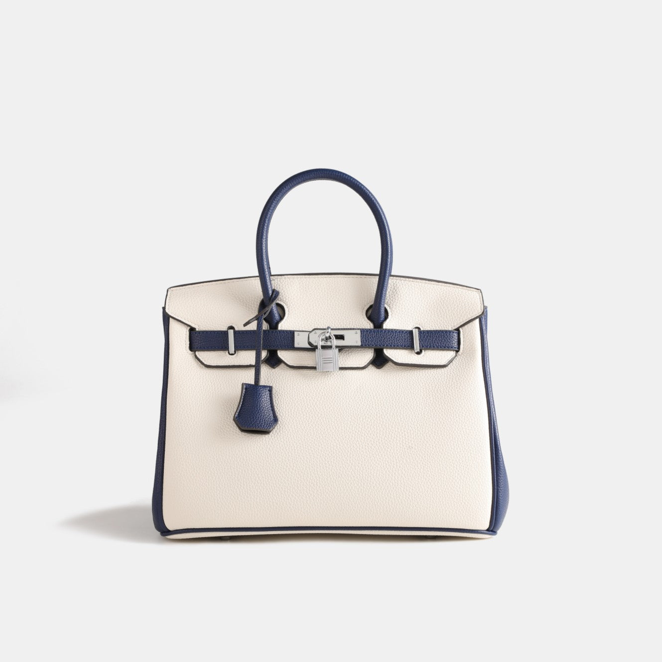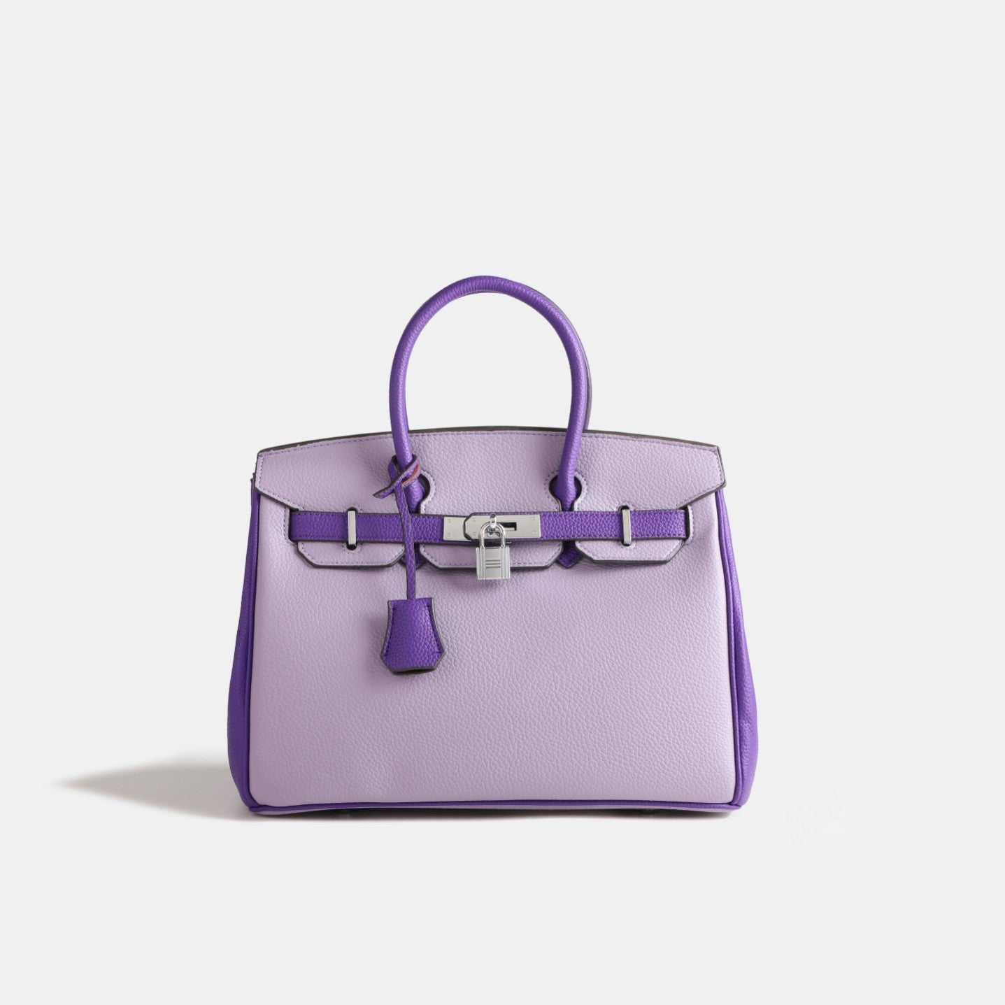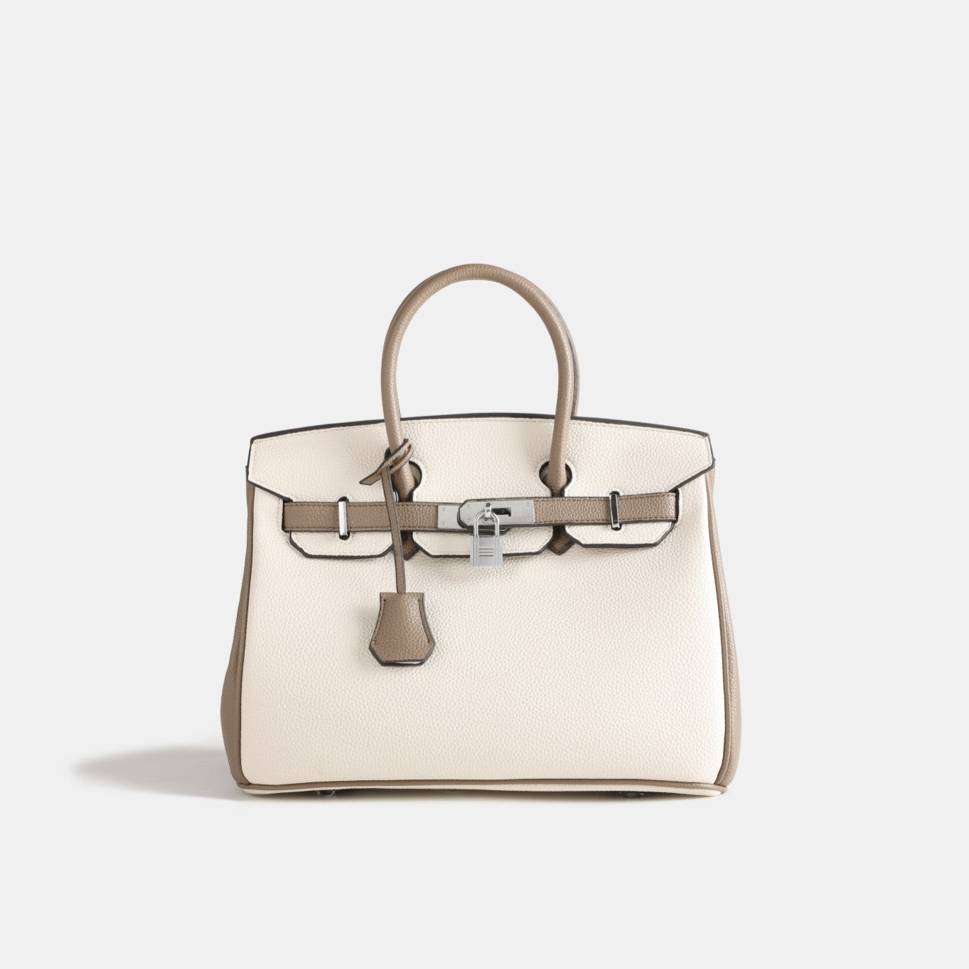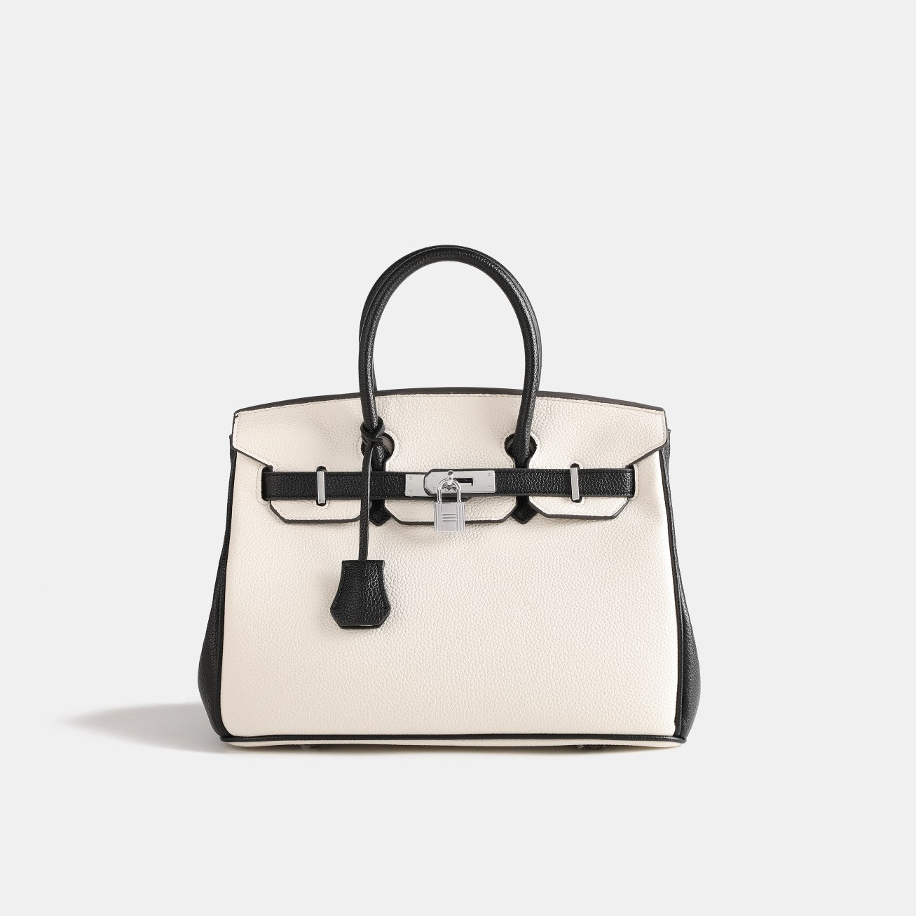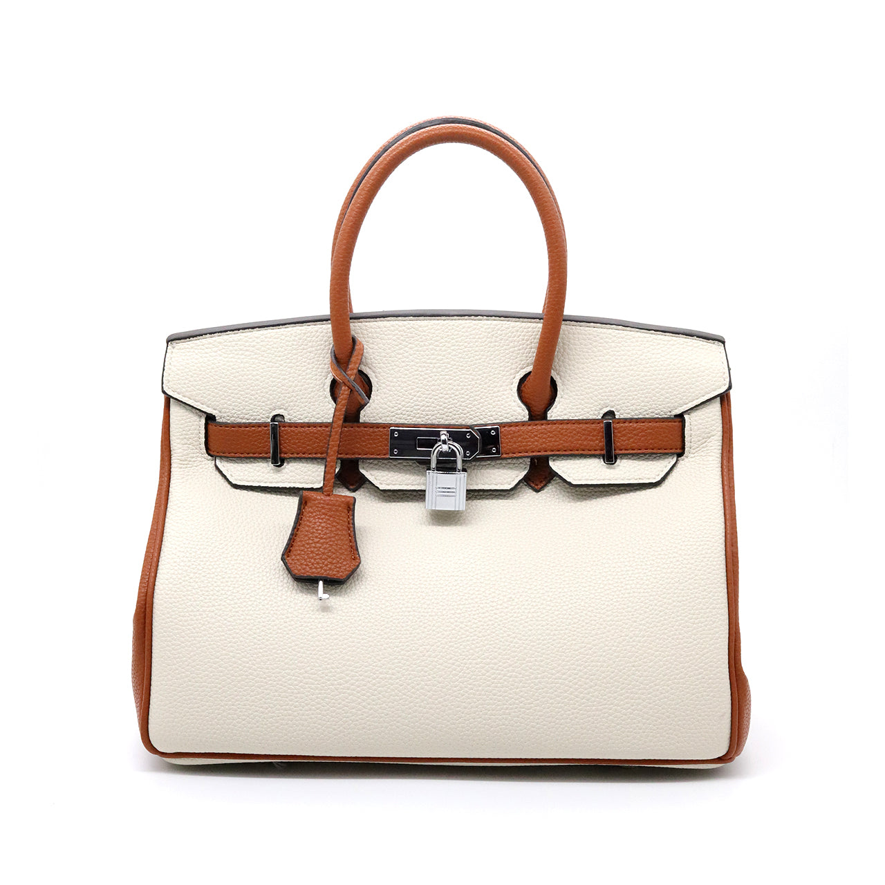 Classic style top handle bag with single flap, wrap through strap with lock, attachable shoulder strap, front side mixed color