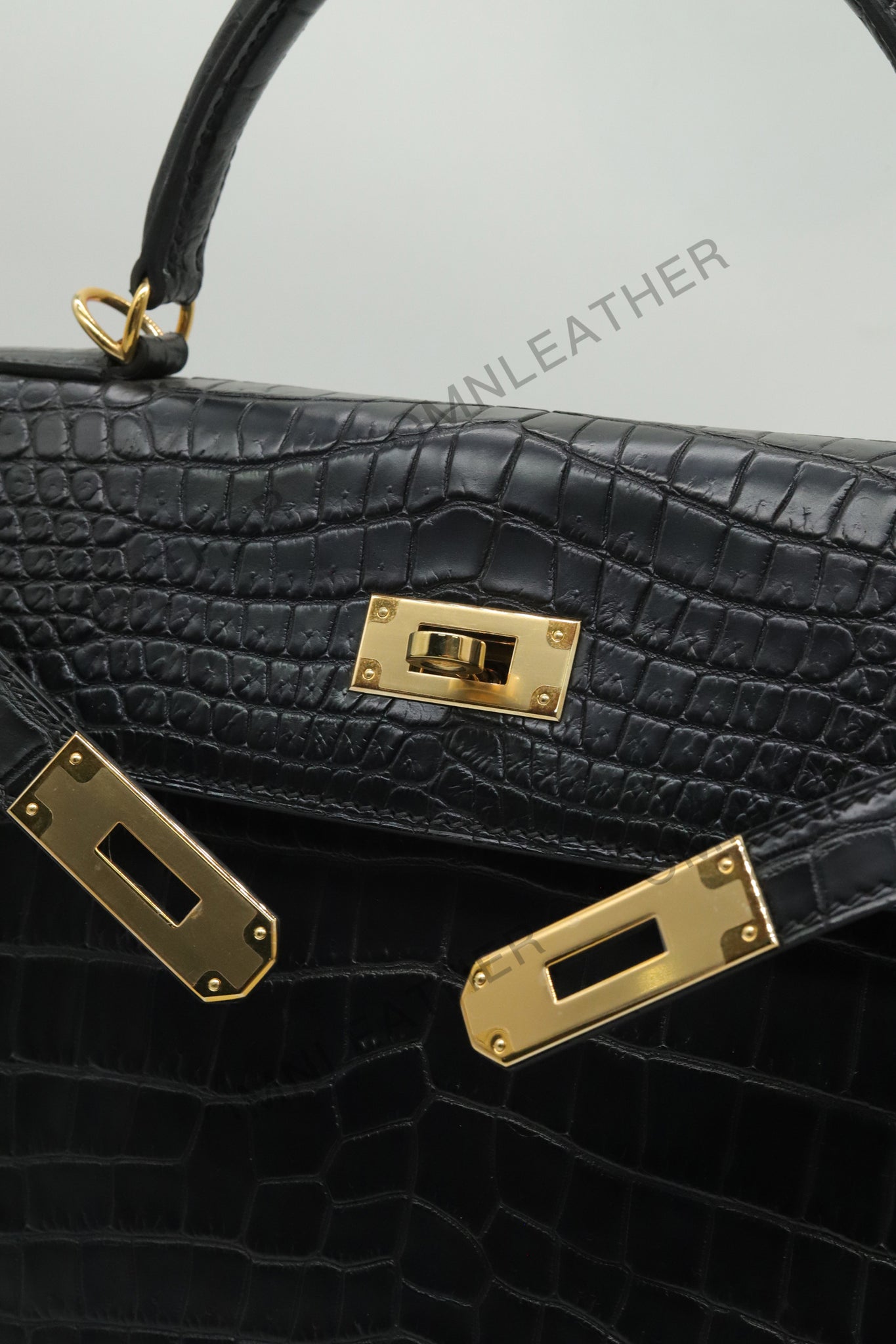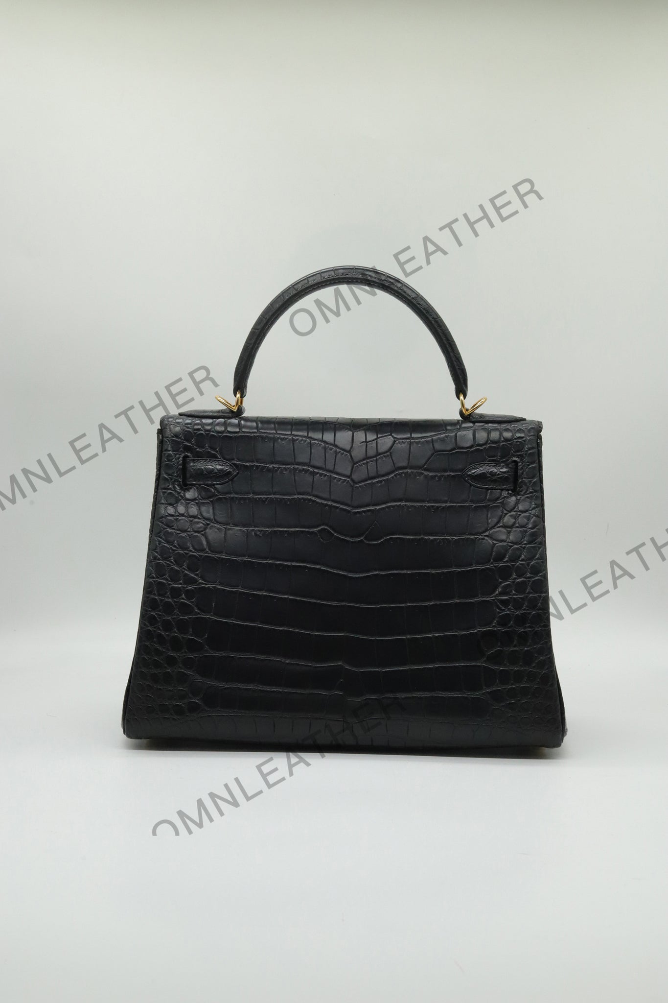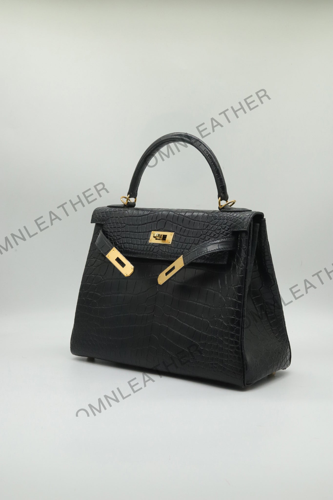 Verona 28 Kelly Style Opaque Saltwater Croc Leather Black Color Gold Hardware