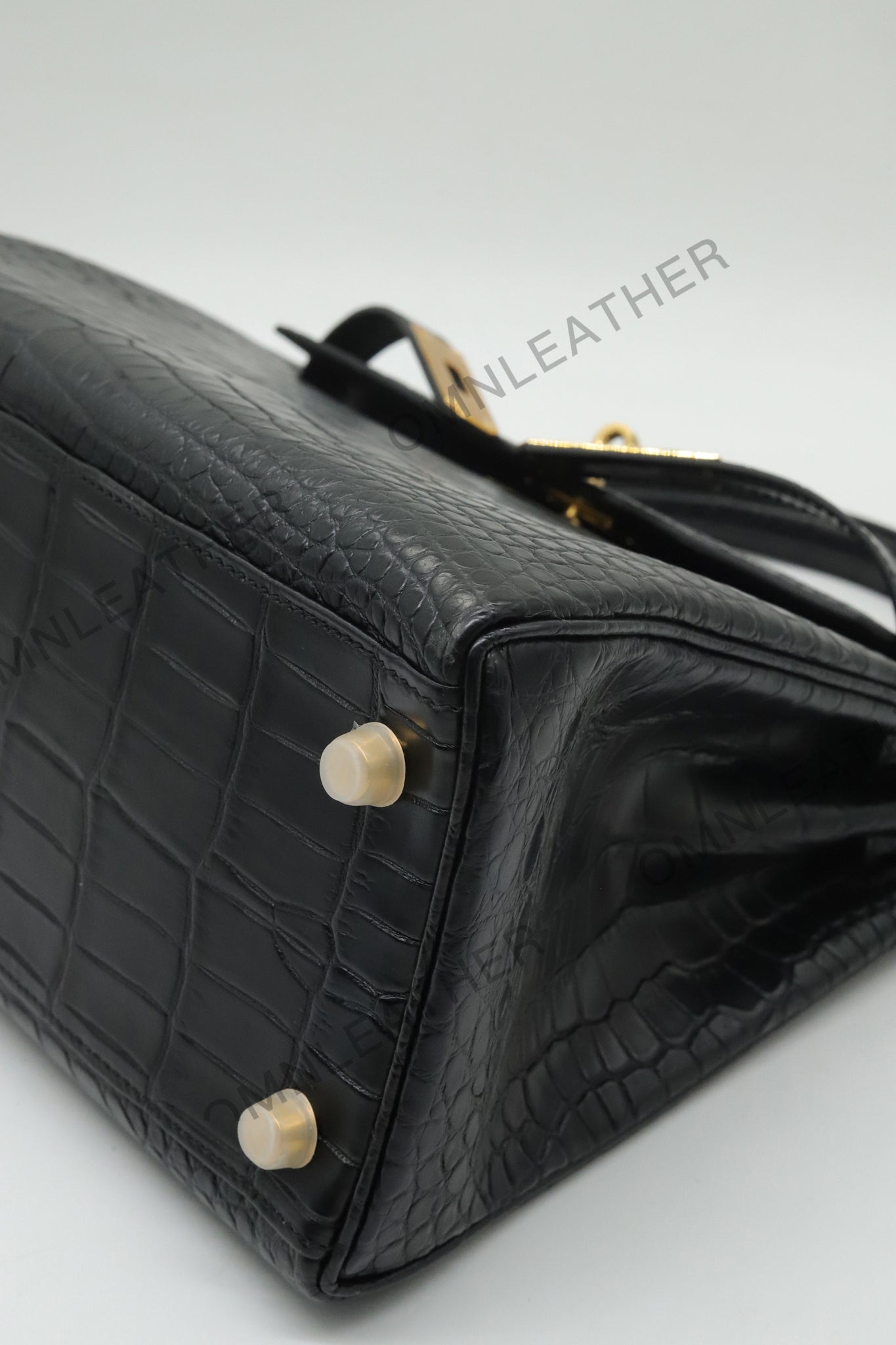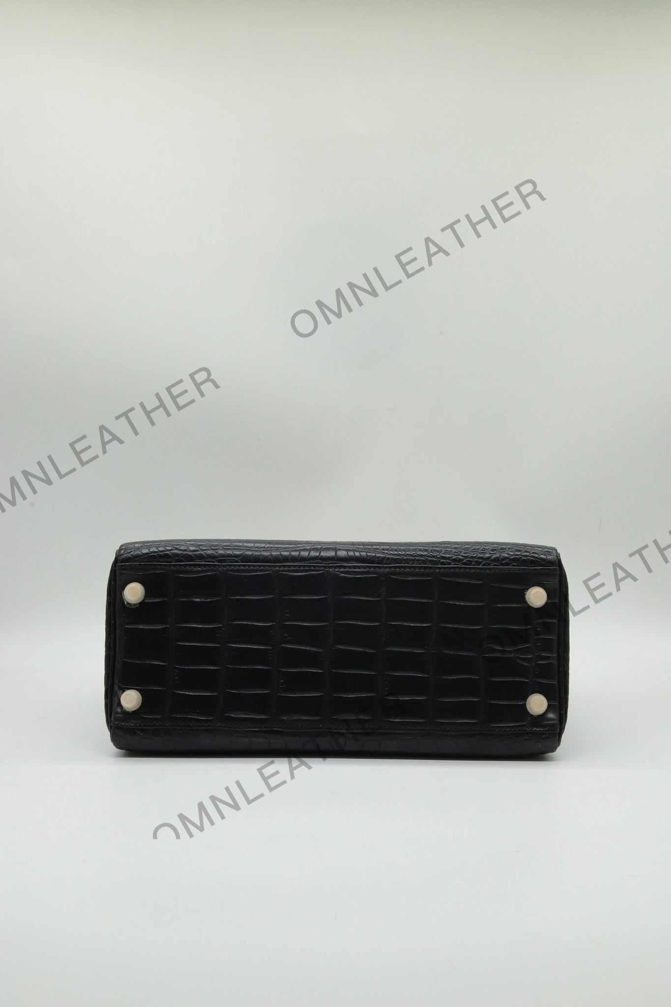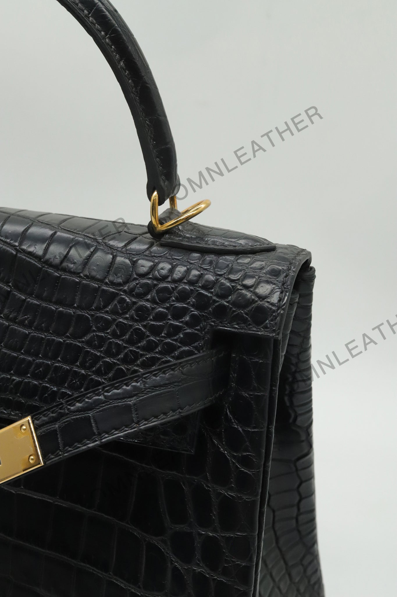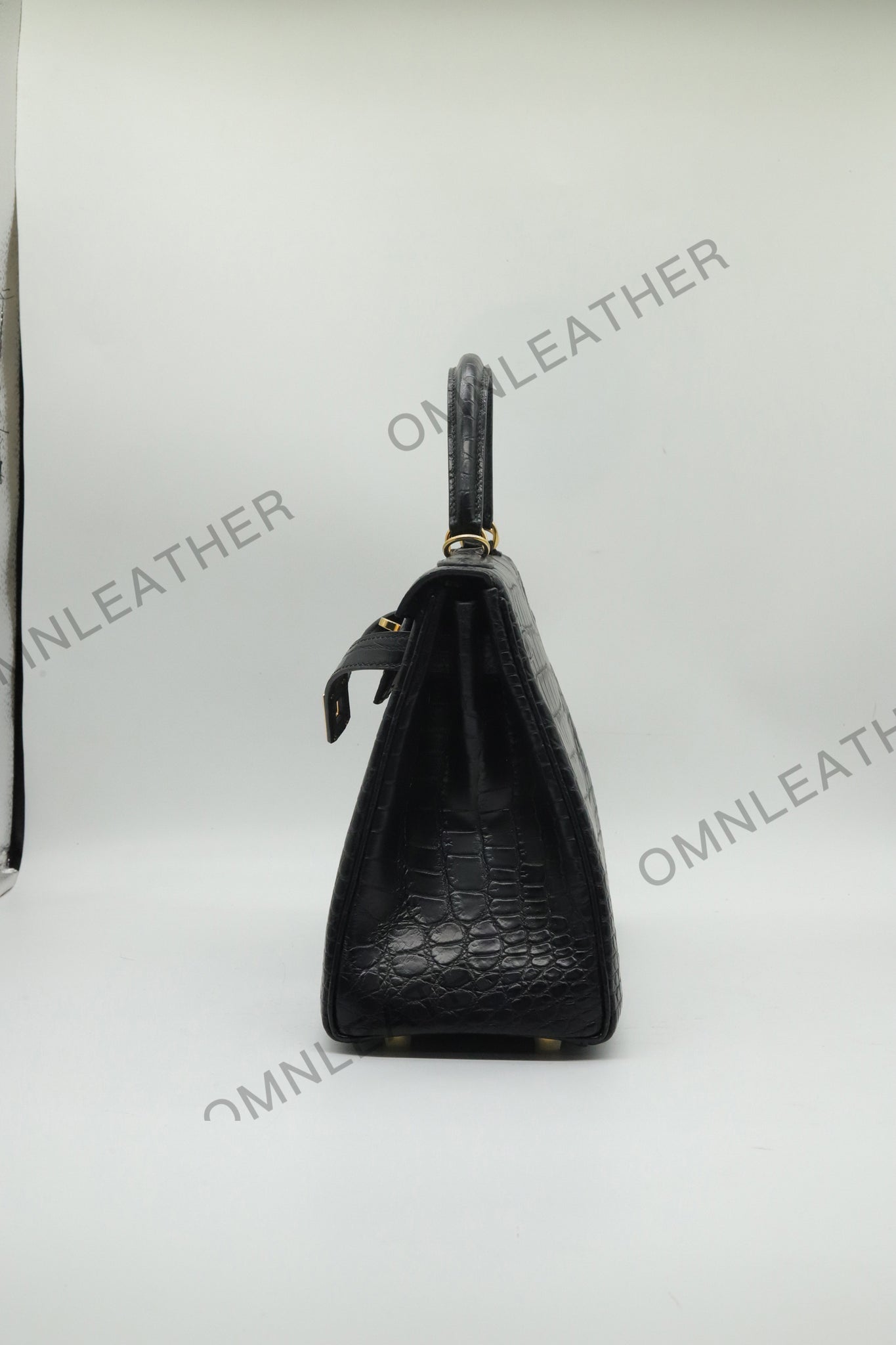 Verona 28 Kelly Style Opaque Saltwater Croc Leather Black Color Gold Hardware